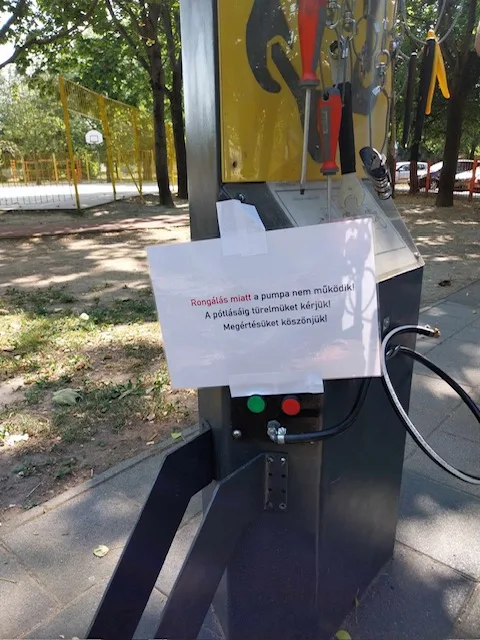 A Laktanya utcai biciklis szervizpontot egy hét alatt másodszorra rongálták meg. A kompresszort vezérlő gombok estek áldozatául a rongálásnak, valamint a szerszámos panelt is elkezdték leszerelni.