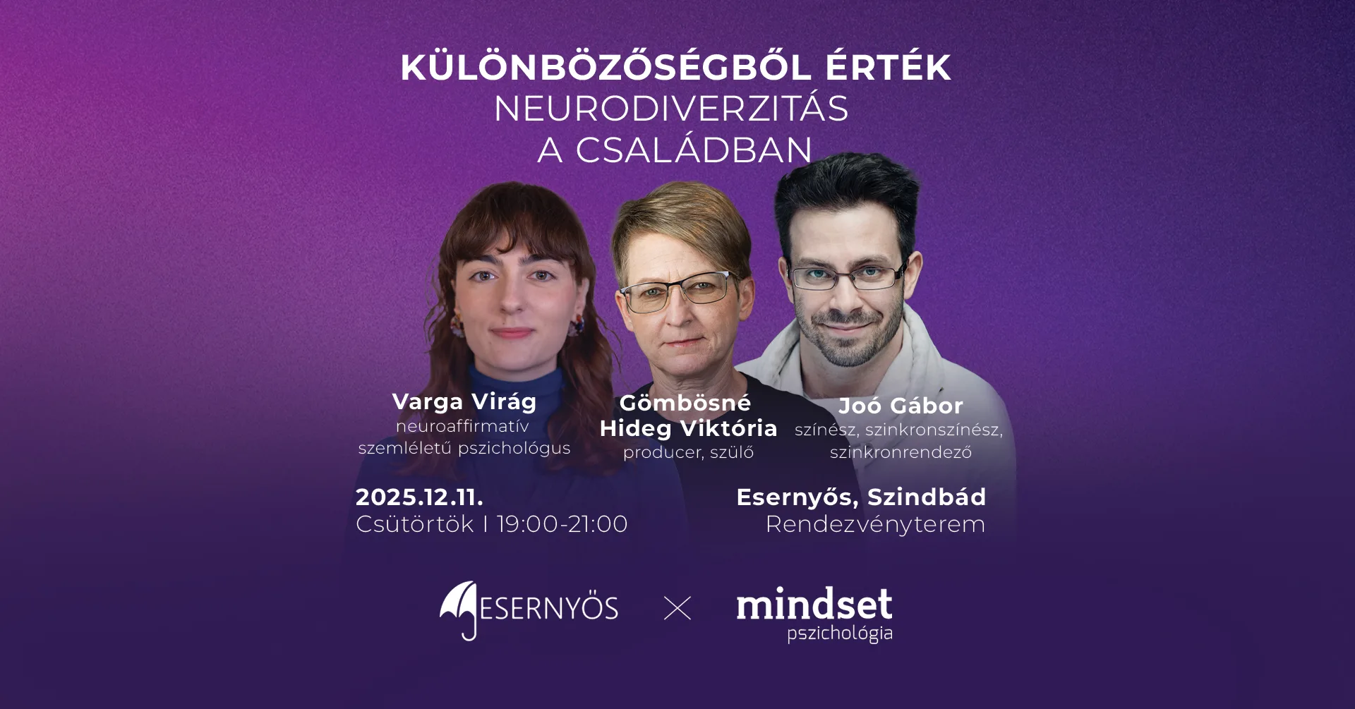 Következő eseményünk célja, hogy komplex módon mutassuk be azon személyek életét, akik idegrendszeri működésük miatt más módon tanulnak, gondolkodnak, viselkednek. Előadók: Varga Virág (neuroaffirmatív szemléletű pszichológus), Gömbösné Hideg Viktória (producer, szülő), Joó Gábor (színész, szinkronszínész, szinkronrendező )