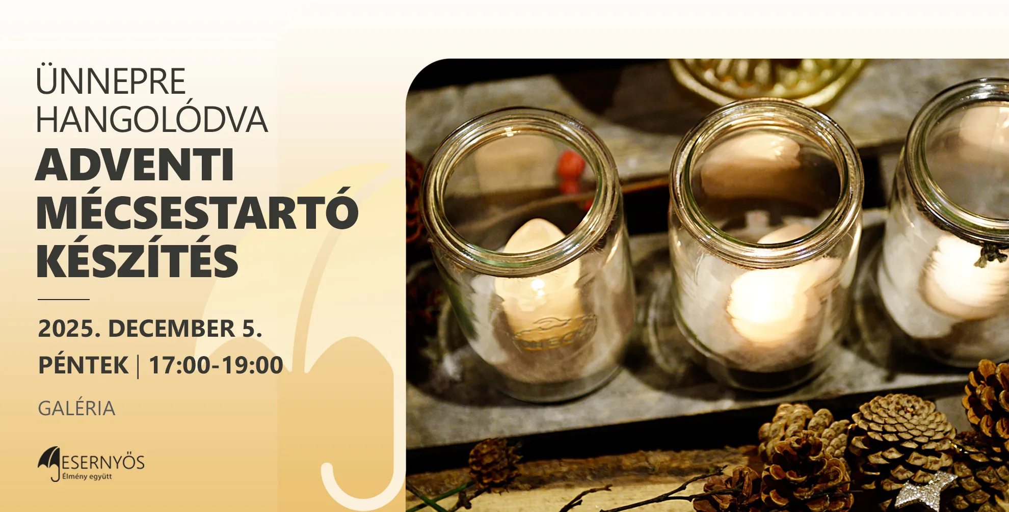 Tartsatok velünk egy közös alkalomra, ahol adventi mécsestartót készítünk befőttesüvegből! A környezettudatosságot szem előtt tartva természetes anyagokkal díszítünk, mint fenyőágak, szárított narancskarikák, fahéj. A foglalkozást Méth Frida, szakképzett foglalkozásvezető tartja.