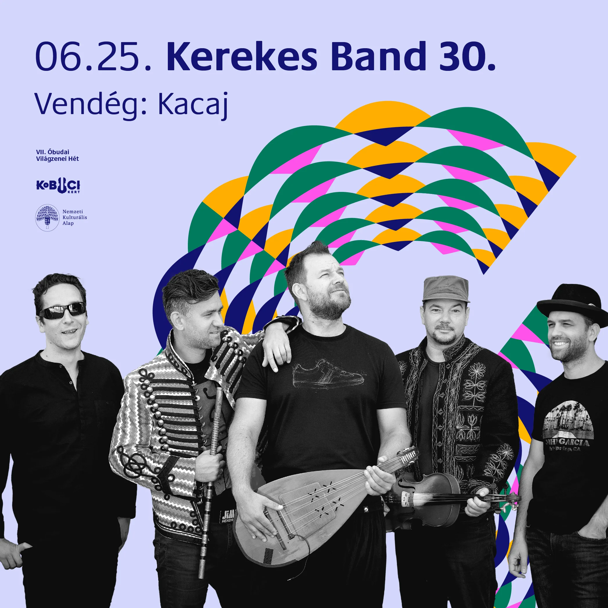 Június 25-én 19 órakor a Kobuci Kertben tartja fennállásának 30. szülinapját a Kerekes Band. A zenekar kezdetektől kísérletező ötösfogata távoli stílusok energiáit gyúrja egybe. Magyar népzenei alapokra, pszichedelikus szólamokat furulyáznak, néha finoman fújva, máskor meg sivítva. Túlzás nélkül állítható, hogy a három évtized alatt felléptek az összes fontosabb hazai fesztivál és koncerthelyszín színpadán, de rendszeresen hívják őket külföldre is. Most például berlini és rodostói koncert után érkeznek Óbudára.