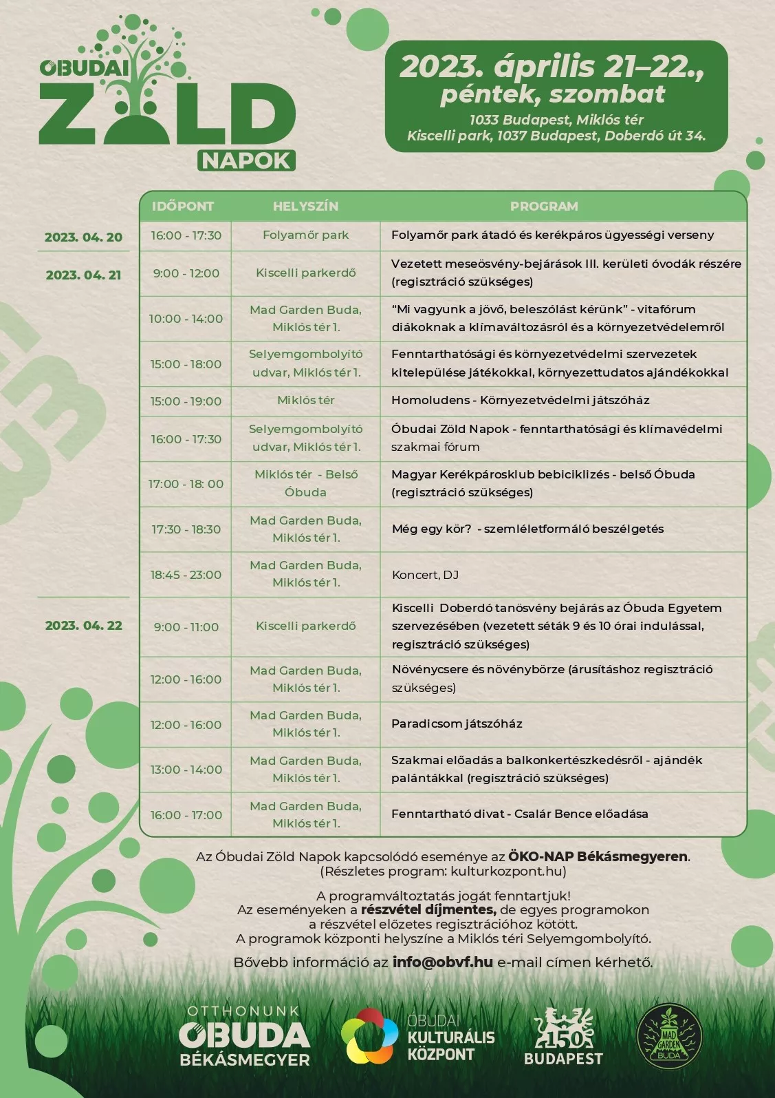 Ugyanakkor minden korosztályt szeretettel várunk, a fesztiválon mindenki megtalálhatja a neki tetsző, izgalmas programot. Lehetőség lesz többek között a Kiscelli parkerdő tanösvényének és meseösvényének bejárására, kerékpáros versenyre, a helyi, zöld szemléletű vállalkozások, civil szervezetek megismerésére, növénycserére és környezetvédelmi ügyekről, gyakorlatokról szóló beszélgetésekre.
