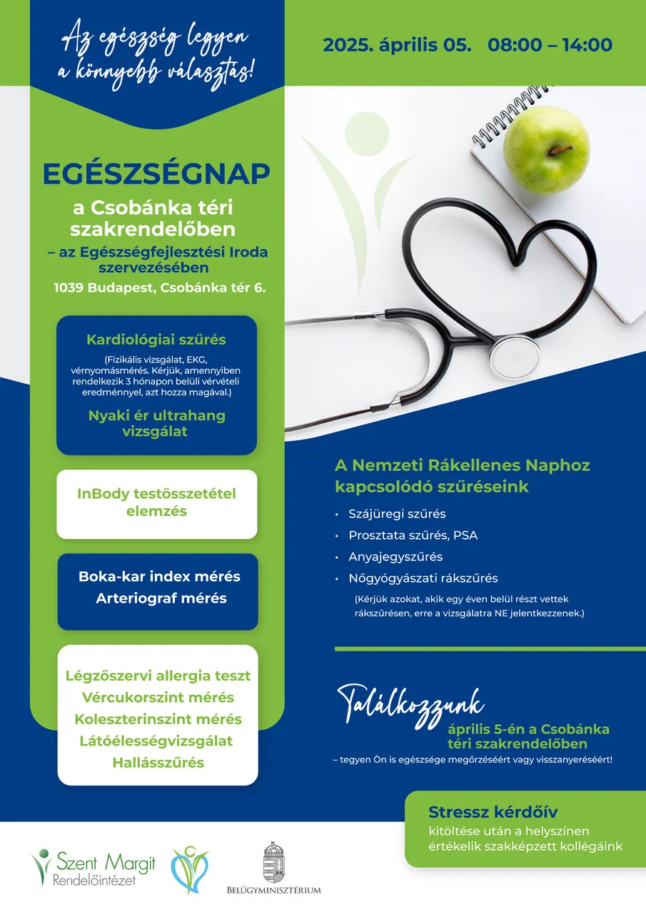 Egészségfejlesztési Irodánk szerevezésében április 5-én (szombaton) 8:00 és 14:00 óra között változatos szűrővizsgálatokon, méréseken, egészségügyi tanácsadáson és állapotfelmérésen vehetnek részt az érdeklődők egészségnapunkon a Csobánka téri rendelőben (1036 Budapest, Csobánka tér 6.).