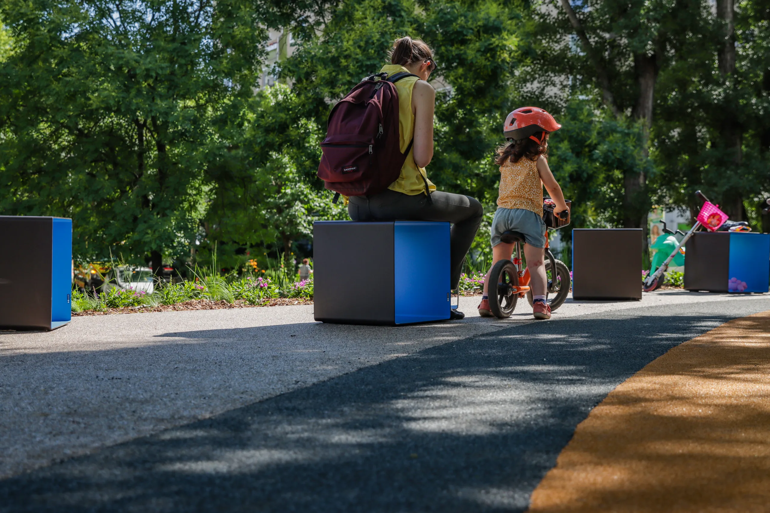 Kerékpárbarát kerületként biciklitárolók elhelyezésére is gondoltunk és természetesen a zöldítés sem maradhatott el: cserje- és évelőszigetet telepítettünk, fákat ültetettünk. Öntözőrendszer óvja a növények egészséges állapotát, cseréltük a hulladéktárolókat is. Mindezek mellett új, színes ülőkockák és padok várják a sétálókat a napelemes kandeláber alatt.