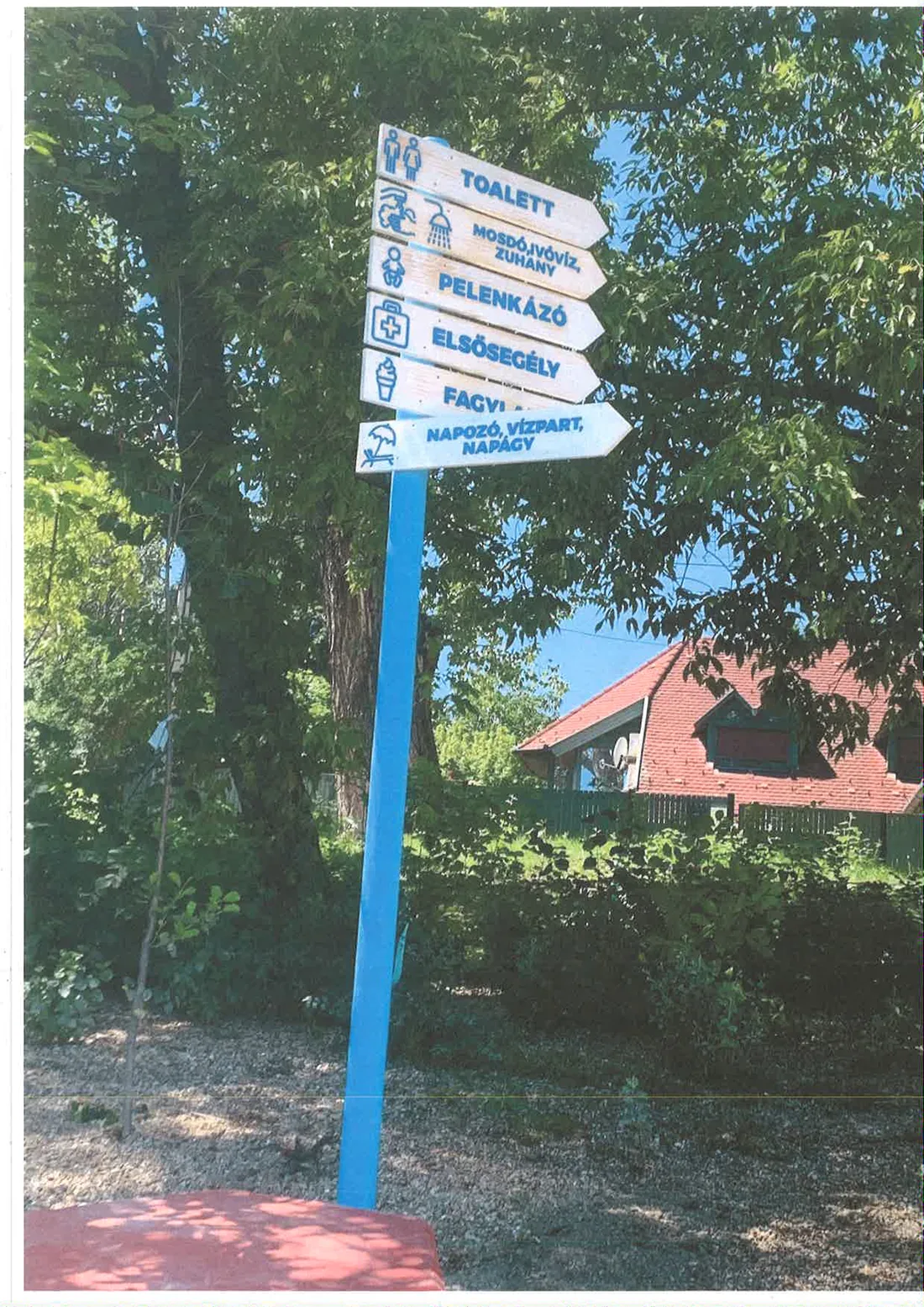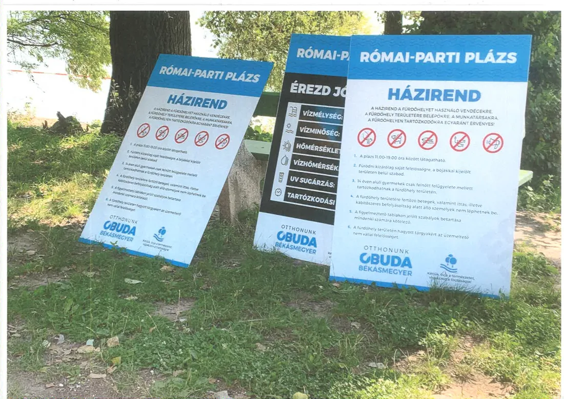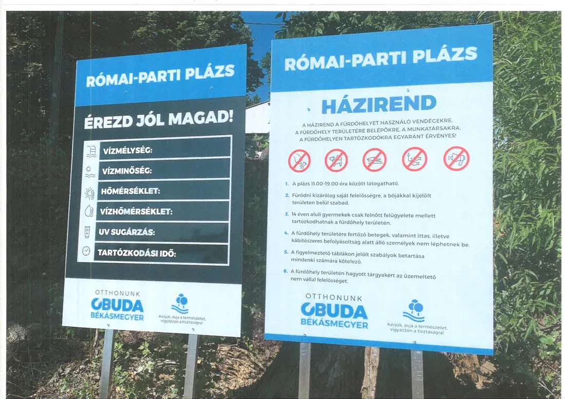 A Római-parti Plázs valamennyi tájékoztató táblája, felirata, berendezése (amit minden évben szezon végén beszedünk, raktározunk és szezonkezdetkor – a szükséges javítások után – újra használunk):