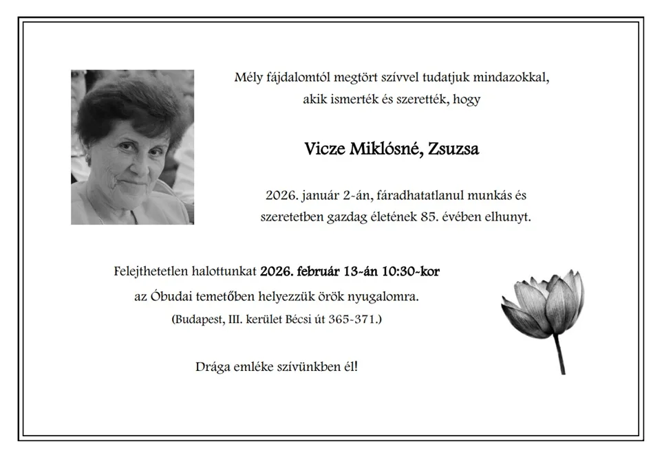 Életének 85. évében hunyt el kerületünk méltán népszerű pedagógusa, a Pro Óbuda díjas Vicze Miklósné Zsuzsa, a kerületi nevelés ügyének leghitelesebb és legerősebb szószólója. Felejthetetlen halottunkat 2026. február 13-án 10:30-kor helyezzük örök nyugalomra az Óbudai temetőben.